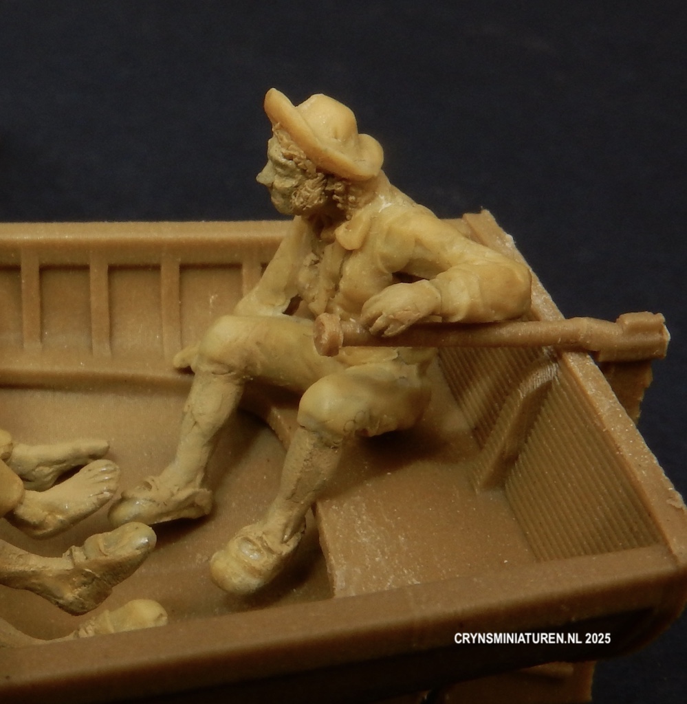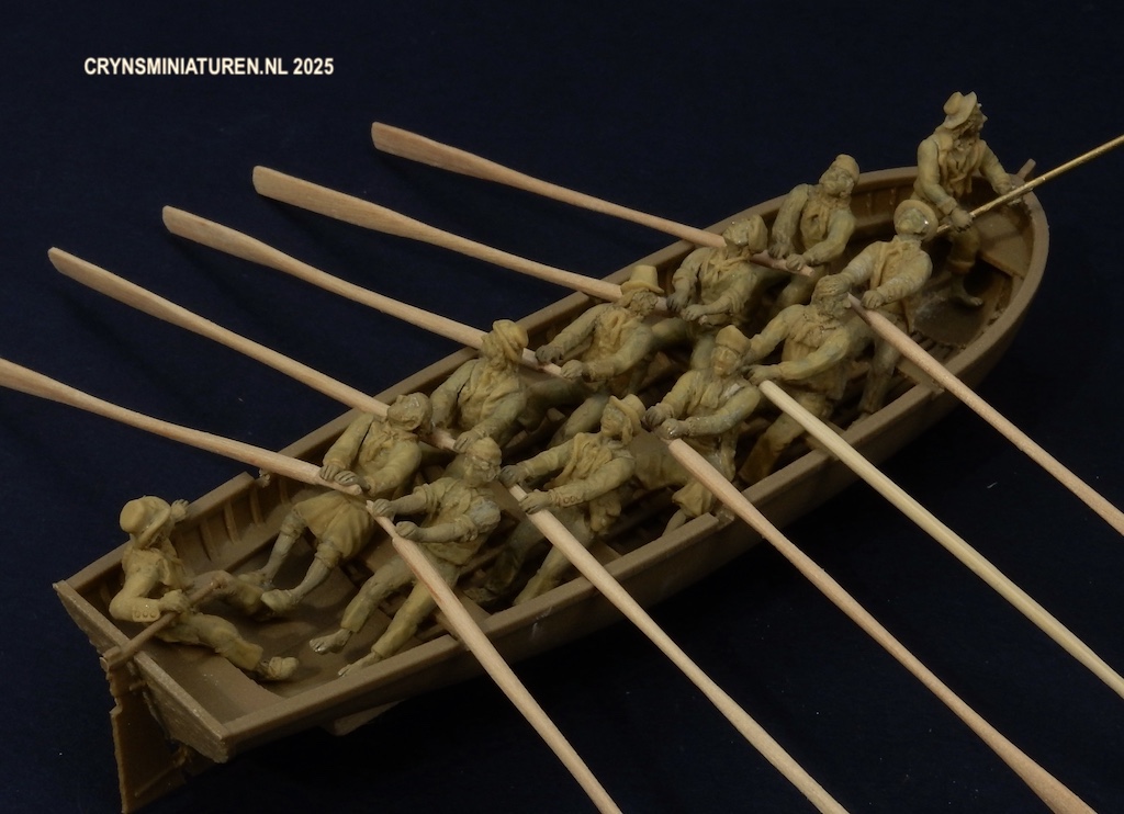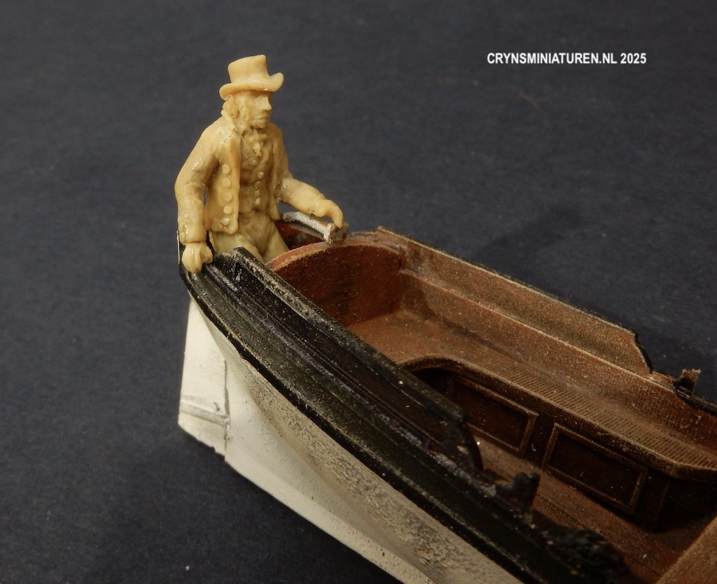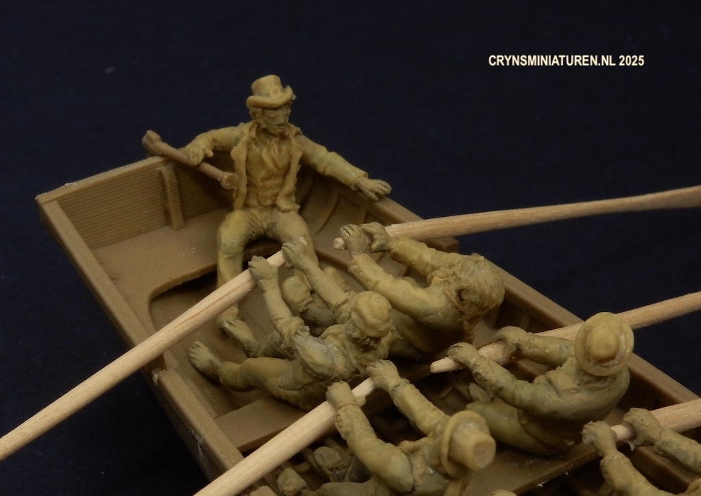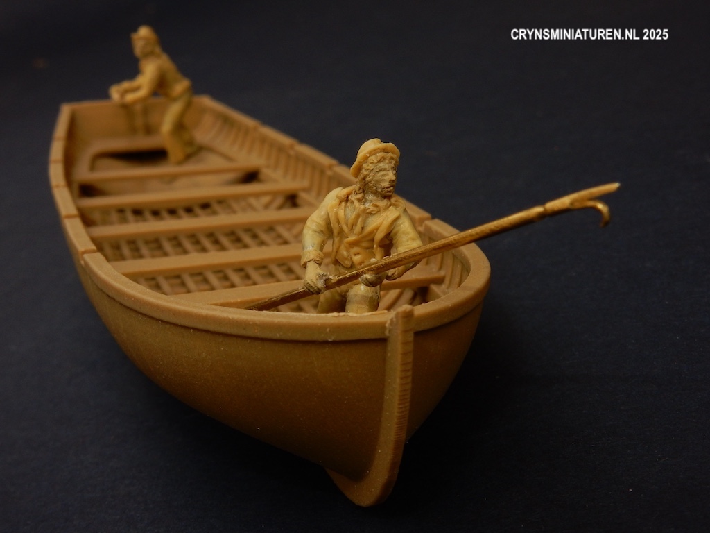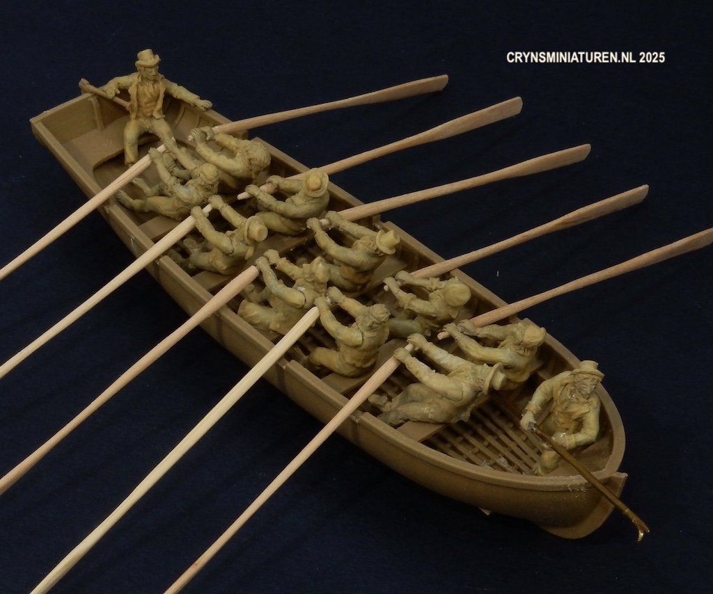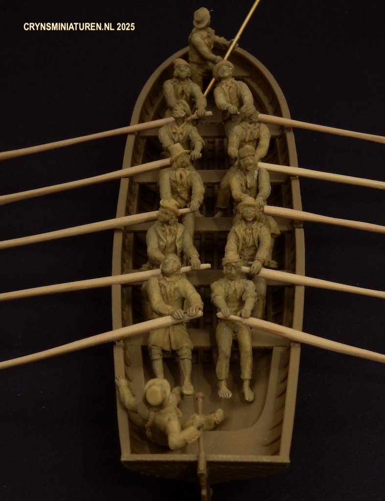 This set includes poses for a Royal Navy ship’s boat crew including five portside rowers, five starboard rowers, a sailor holding a boat hook, a standing helmsman steering pinnace or barge, and two sitting helmsmen steering launch, cutter or jollyboat